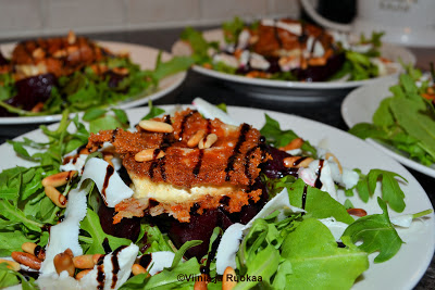 - Asettele punajuuret ja paistettu juusto kauniisti lautaselle.