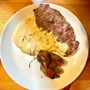 - Laita lautaselle kastiketta ja siihen viereen pihvi ja lisukkeet. Nauti!